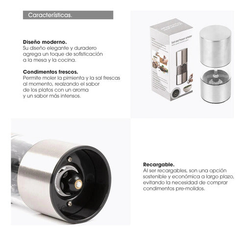 MOLINILLO PIMENTERO ACERO INOXIDABLE MANUAL El molinillo pimentero de acero inoxidable es un accesorio indispensable para tu cocina, destacándose por su diseño elegante y funcional. Con una altura de 12 cm, es perfecto para utilizarlo en cualquier espacio de cocina o comedor sin que ocupe mucho lugar. Su construcción en acero inoxidable garantiza durabilidad, resistencia y facilidad de limpieza, mientras que su mecanismo permite moler pimienta de manera eficiente, mejorando el sabor de tus platos con cada uso. · Fabricado en Acero Inoxidable · Facil de lavar y guardar · Decorativo y moderno · Mantiene tus condimentos bien conservados · Diseño elegante y funcional · Herramienta esencial en la cocina · Permite moler pimienta fresca y sal gruesa con precisión, realzando el sabor de tus platos · Medidas: Alto 12.5cm x Ancho 5cm