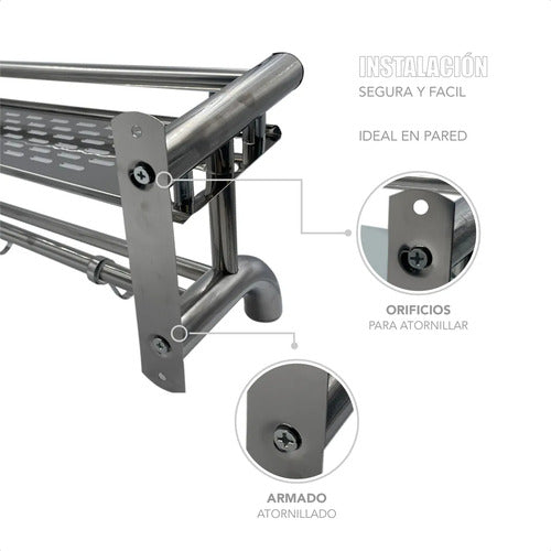 ESTANTE ORGANIZADOR DE BAÑO ACERO INOXIDABLE Organiza tu baño con estilo y practicidad con este elegante estante organizador. Diseño moderno y fácil de limpiar. Estructura de acero inoxidable resistente al agua garantiza durabilidad y protección contra la humedad. Ideal para mantener tus productos de baño al alcance, cuenta con un barral perfecto para toallas y ganchos para colgar accesorios como esponjas o cepillos. · Fabricado en Acero Inoxidable · 4 Colgantes reforzados · Reforzado · Fácil de instalar · Excelente calidad · Resistente al agua · Barral fijo para toalla · Diseño moderno y fácil de limpiar · Añade un toque sofisticado a tu baño · Ideal para mantener tus productos de baño al alcance · Medidas: Alto 18cm x Ancho 49cm x Prof. 14cm