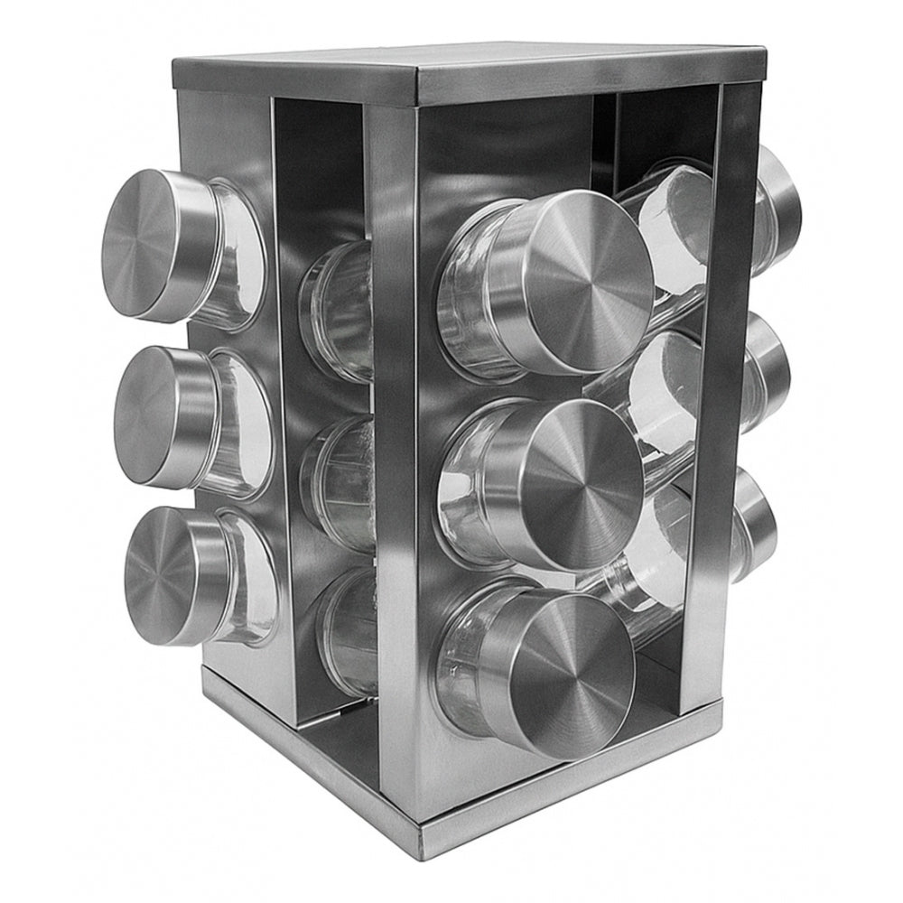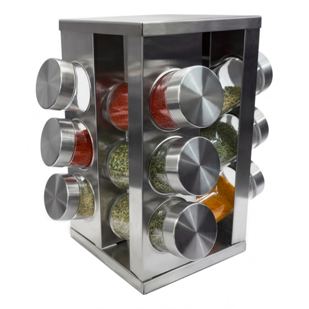 Descubre el Especiero Giratorio Cuadrado X12, una solución elegante y funcional para mantener tus especias organizadas. Este especiero incluye 16 frascos de vidrio, cada uno con tapa de acero inoxidable, que no solo preservan la frescura de tus especias, sino que también añaden un toque rústico y sofisticado a tu cocina.