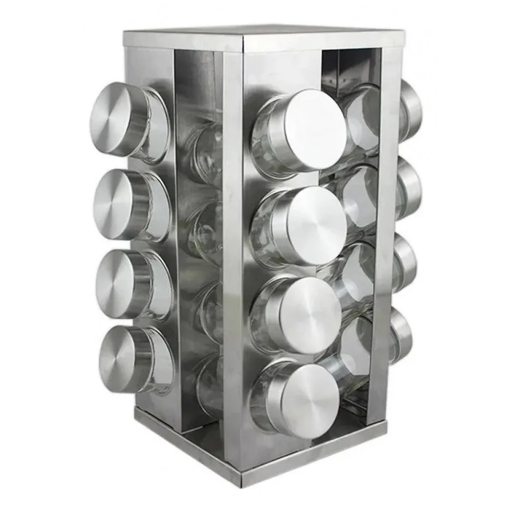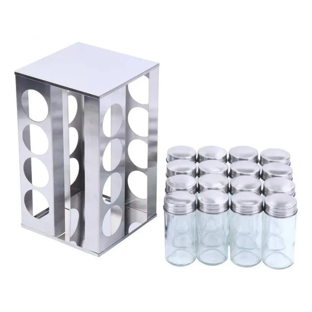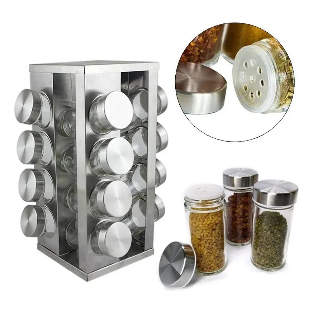 Descubre el Especiero Giratorio Cuadrado X16, una solución elegante y funcional para mantener tus especias organizadas. Este especiero incluye 16 frascos de vidrio, cada uno con tapa de acero inoxidable, que no solo preservan la frescura de tus especias, sino que también añaden un toque rústico y sofisticado a tu cocina.