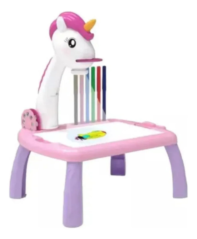Esta encantadora mesa proyectora está fabricada en plástico resistente y de fácil limpieza, lo que la convierte en una opción práctica para el uso diario. Su diseño en color rosa con detalles de unicornio la hace visualmente atractiva para los más chicos, convirtiéndola en el centro de atención dentro de cualquier espacio de juegos o habitación infantil.