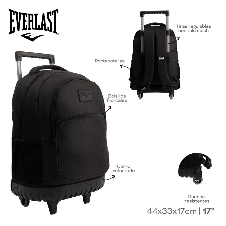 Mochila con carro Everlast de 17 pulgadas, diseñada para quienes buscan resistencia, capacidad y un estilo deportivo premium. Fabricada en cordura, un material altamente duradero, ideal para uso intensivo en escuela, viajes o actividades diarias.