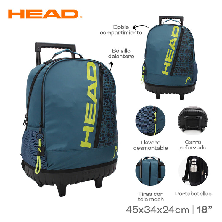 Info: llavero desmontable, 2 compartimiento y bolsillo frontal, carro reforzado, tiras mesh, portabotellas