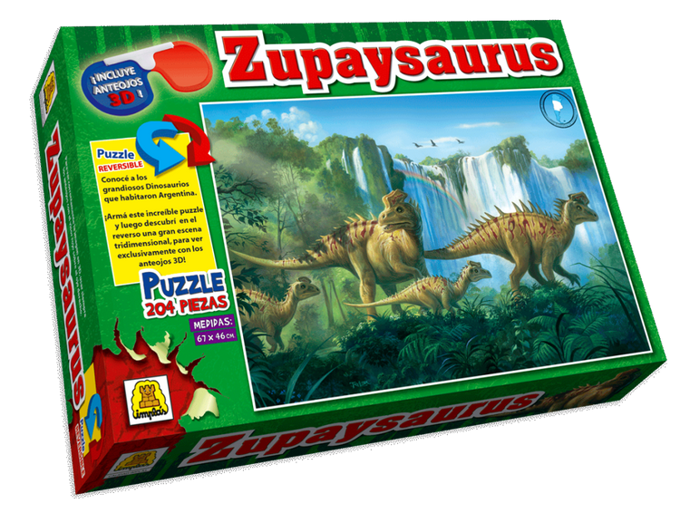 Puzzle reversible. Temática dinosaurios que habitaron Argentina. Al terminar de armar el puzzle, en el reverso, podrás ver la escena tridimensional con los lentes 3D.