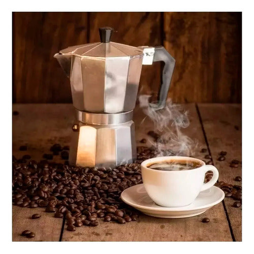 La cafetera italiana de 300 ml, fabricada en aluminio, tiene una capacidad para 6 tazas, convirtiéndola en una opción ideal para hogares pequeños o para disfrutar de un café rápido. Es un producto indispensable en tu cocina por su facilidad de uso y su diseño práctico, además de ser muy fácil de lavar. Esta cafetera manual es compatible con superficies de inducción, eléctricas, cerámica y fuego directo, lo que la hace versátil y adaptable a diferentes tipos de cocinas.